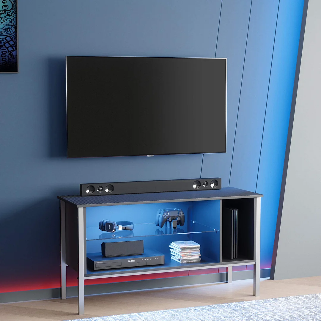 Designed as the perfect area to fit into any living room, bedroom or entertainment center, it adds a modern decor to the space. The Bestier TV stand has three large open shelving areas to house your entertainment equipment. The Power Cable Management Port is in the back, which can store the LED light cable completely, making the whole look elegant and tidy. Tabletop with a rich finish and long-lasting protective layer for easier cleaning. The LED light strip can pass the light through the glass to form the background light, so that you can switch different scenes to create the atmosphere at home according to your mood.