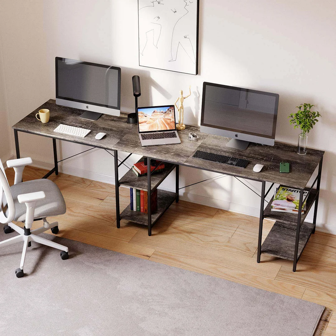 The 95.2 inch large l shaped desk has 4 Tier Adjustable Shelves and 3 Cable Holes, very multifunctional as a gaming desk, corner desk, 2 person desk or long desk for working from home.