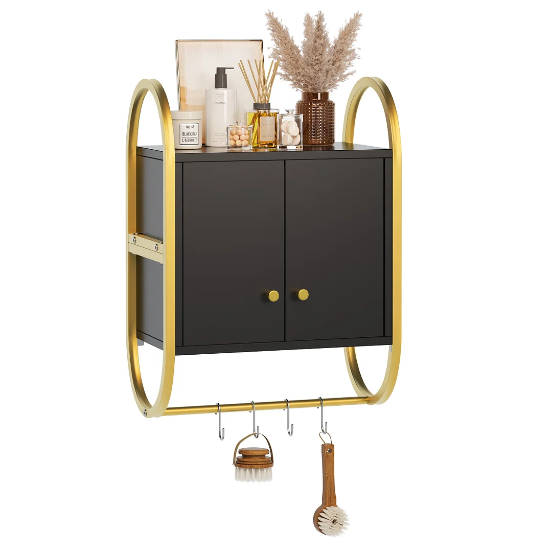 Sturdy and Durable: The storage cabinet is crafted from high-quality P2 board, offering excellent water and moisture resistance for long-lasting use. Its elegant black finish, complemented by a gold tube, adds a touch of sophistication to your decor. The cabinet is equipped with magnets and two gold round handles for easy opening and closing.