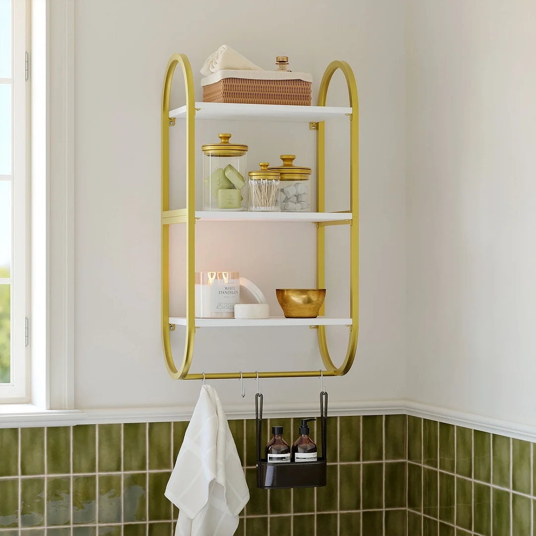 The Bestier 16 x 9.5 inch 3 tier oval wall shelf is a versatile floating shelf that enhances any room with additional storage space. Ideal for the bathroom, bedroom, living room, or kitchen, this shelf is designed to accommodate a variety of items. With its three-tier design and 4 additional hooks, it provides ample space for toiletries, decor, or kitchen essentials. The towel rack adds an extra layer of functionality, offering a convenient hanging storage solution. Crafted for durability, this shelf is easy to clean and maintain, making it a practical and stylish addition to your home. Enhance your home organization with the Bestier oval wall shelf.