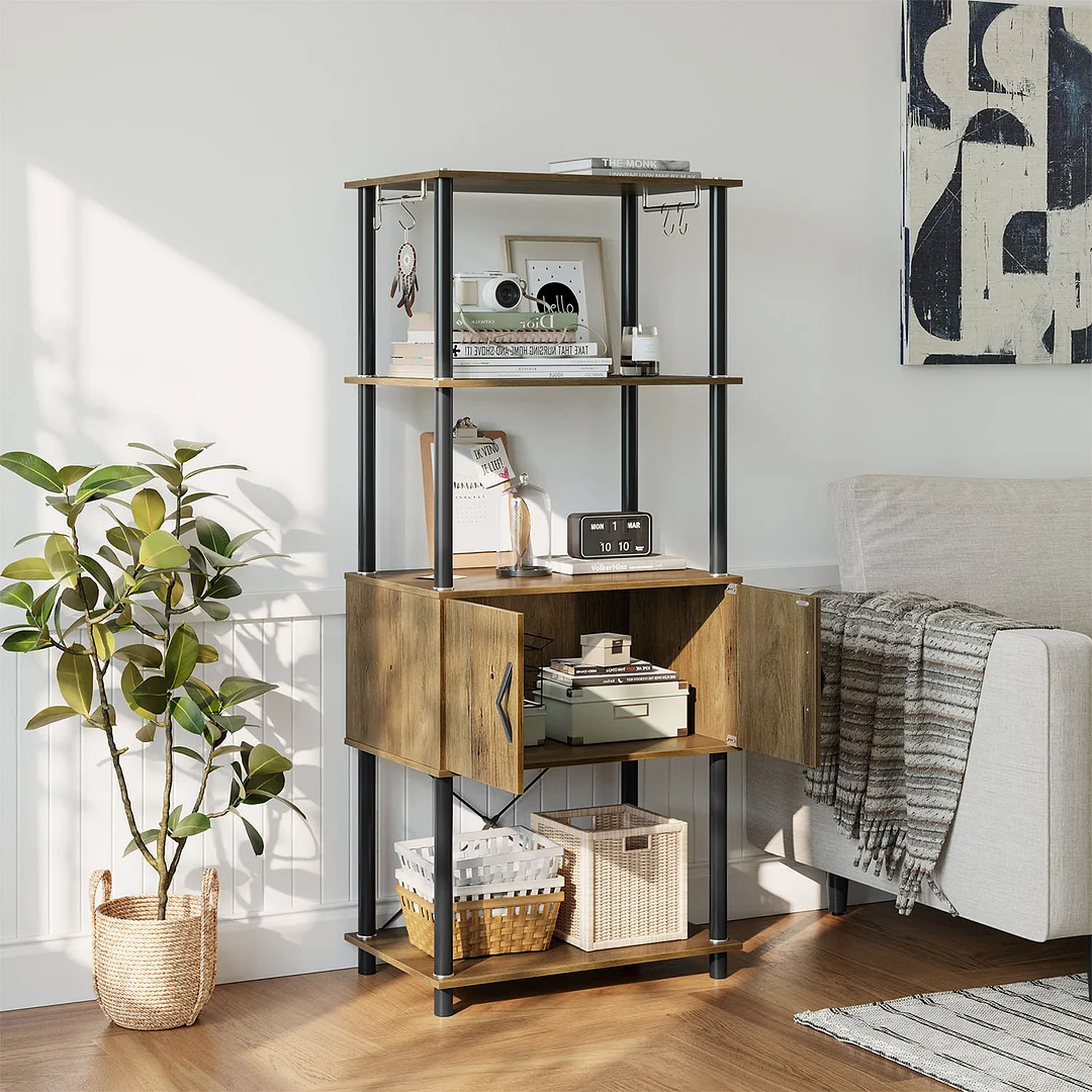 Small But Mighty: Designed with 4-Tier shelves, a storage cabinet & 4 hooks offer plenty of storage space while saving a lot of floor space to store microwave oven, teapot, coffee maker, dishes, or other items like books, photos, CDs, trinkets and etc.