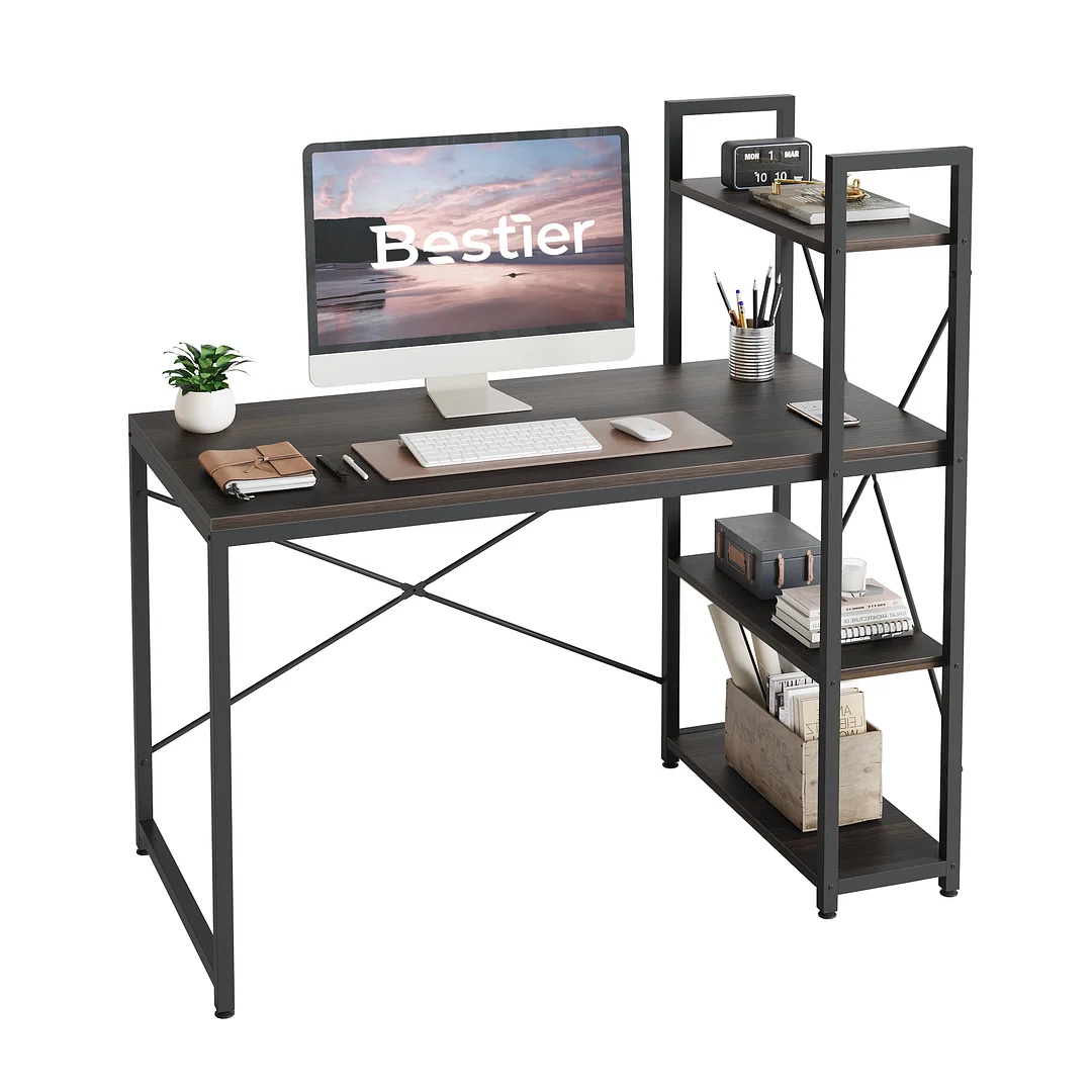 Your Ultimate Workspace Solution. Available in versatile sizes of 47, 55, and 63 inches, Bestier desks cater to various room sizes and user needs, whether you're a student, professional, or gamer, offering the perfect fit for your bedroom, home office, or gaming room. Featuring flexible storage options with four shelves and an adjustable shelf, users can customize the space to accommodate their unique requirements, be it a computer tower, books, or office supplies. Built with durability in mind, our desks boast a sturdy P2 particle board construction, supporting up to 80 pounds on the desktop and 25 pounds on each shelf, ensuring both high load capacity and stability with a metal back brace and adjustable foot pads. With a minimalist design that seamlessly blends into any decor, our desks add elegance to your workspace while being environmentally friendly. Backed by an 18-month warranty and excellent customer service, along with easy assembly instructions and pre-drilled holes, our commitment to customer satisfaction and convenience makes Bestier desks the top choice for discerning users everywhere.