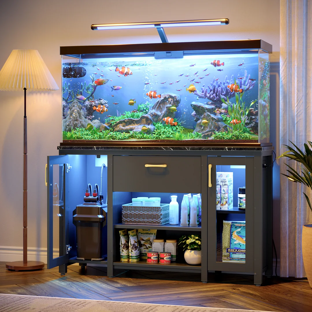 Modern Stylish Design: With the black marble tabletop and gold handle design, this aquarium stand with cabinet seamlessly complements various home decor styles. It adds a touch of sophistication to your living space.
