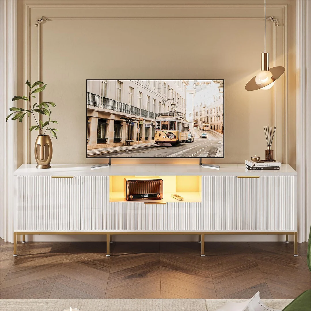 The Bestier Modern High gloss Fluted TV Stand with LED Light is a stylish and multifunctional addition to any living room, bedroom, or office. This chic LED TV stand, with its fluted door panels, high-gloss finish, and gold accents, offers a contemporary aesthetic that complements any decor. Designed to accommodate TVs up to 60 inches, this modern entertainment center features a large drawer, two enclosed cabinets, and an open shelf equipped with remote-controlled LED strip lights. Constructed from premium PB board and a sturdy metal frame, this 55 inch/ 70 inchTV console ensures durability and easy maintenance. The high gloss TV cabinet also includes 6 adjustable foot pads for enhanced stability and floor protection. Although assembly is required, the package includes detailed instructions and all necessary tools for a hassle-free setup. The assembled dimensions of this LED entertainment center are 21"H x 55"W x 14"D/ 23"H x 70"W x 15"D.