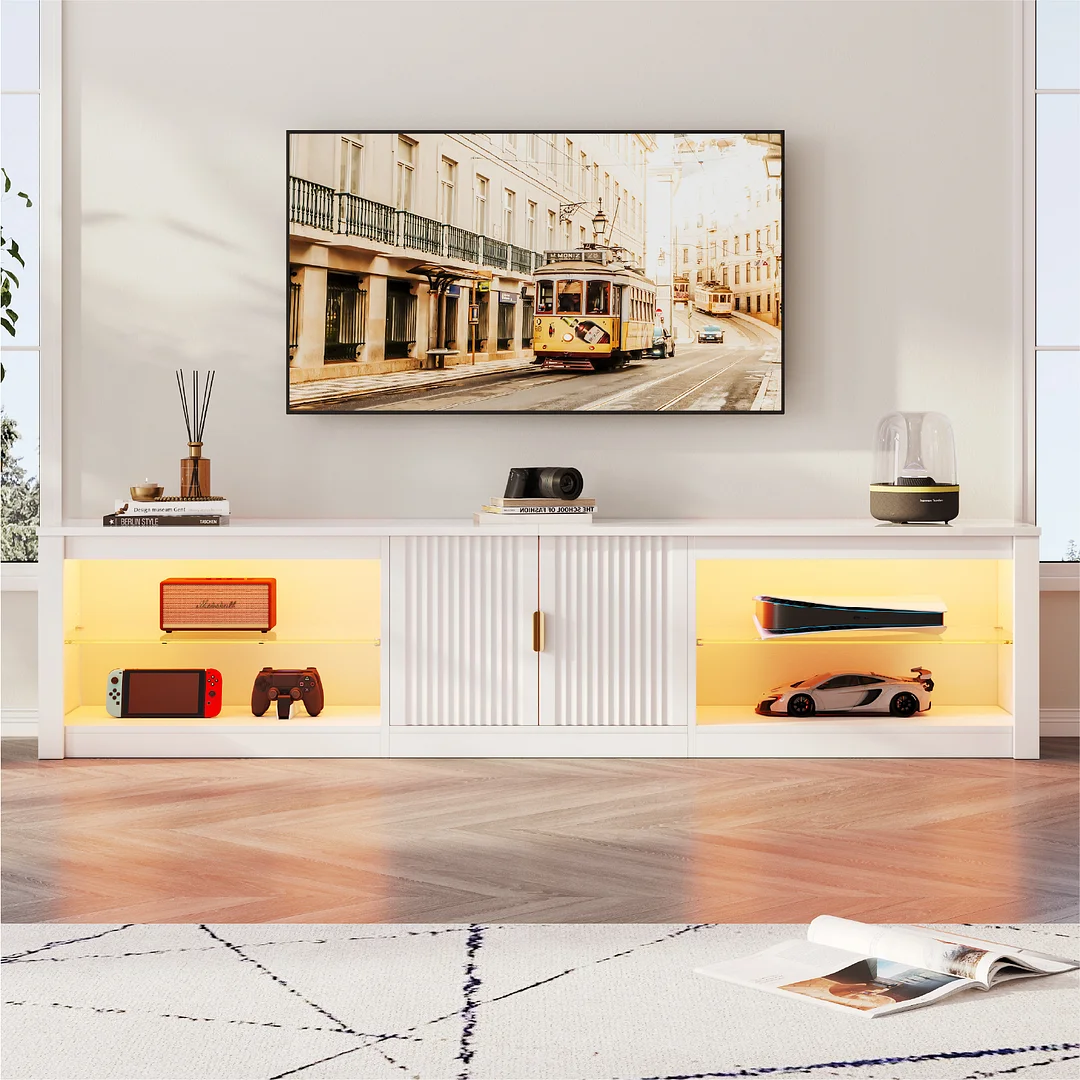 Transform your living space with the Bestier LED TV Stand, designed to accommodate TVs up to 85 inches. This tv stand features a modern design with a black high gloss finish and fluted doors, adding a sleek touch to your living room, family room, or bedroom. It offers ample storage with four open shelves and two enclosed cabinets, perfect for housing your entertainment components like gaming systems, DVD players, and remotes. Crafted from CARB-certified P2 particleboard, this entertainment center ensures durability and safety. The LED light strip, featuring 7 vibrant colors and 22 dynamic modes, enhances your gaming atmosphere, while the adjustable 4mm tempered glass shelves reflect the RGB lights, creating a dynamic and unique ambiance. Experience a blend of style and functionality with our 80 inch tv stand.