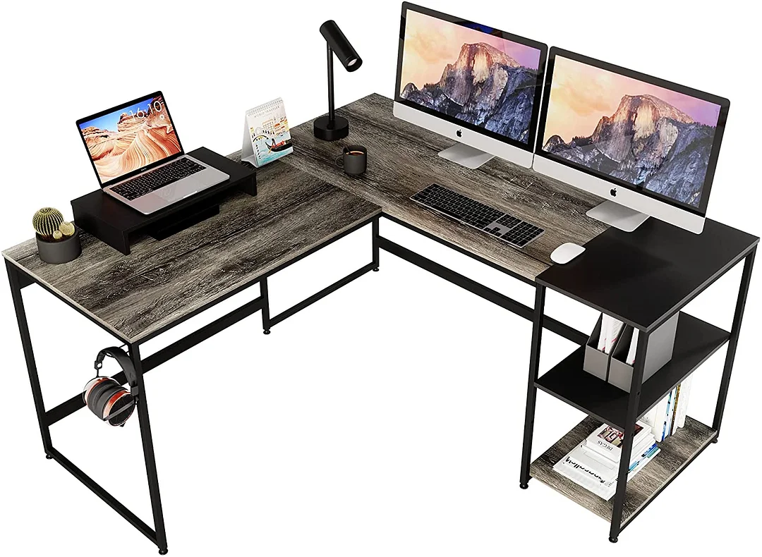 Adjustable Shelf: 2 tier shelves offer extra room for books and office accessories, and the middle shelf can be moveable to put PC tower.In addition,with a cable hole and a headphone hook, the l shaped desk functions better in home and office.