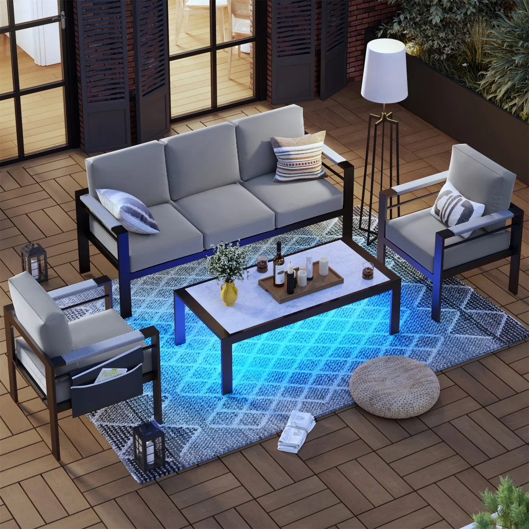 Easy Cleaning: When the modern aluminum led outdoor patio set comes to upkeep, we suggest wiping it clean with a soft, damp cloth. The zip-off cushion covers are removable and quick-drying, just take off and throw them into the washing machine for easy cleaning. Go ahead, leave this furniture couch seating outside in any season and soak up the sun!