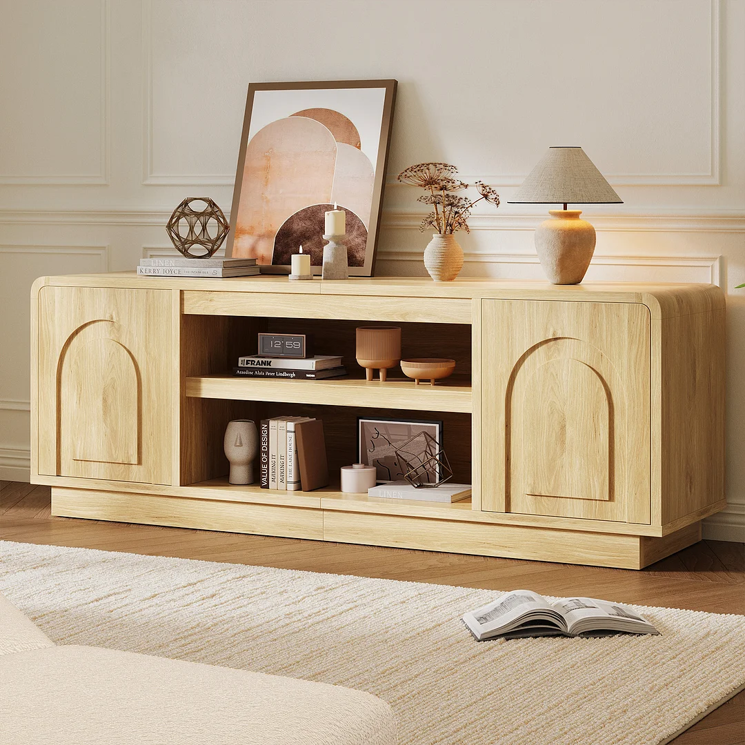 Elevate your home entertainment with this Mid-Century Modern TV Stand, a stylish and functional entertainment center designed for TVs up to 70 inches. This unique media console cabinet sets itself apart with elegant arched doors and safe curved corners, making it a perfect child-friendly furniture piece for your living room or bedroom. The highlight of this unit is the spacious middle open shelf, which serves as an ideal gaming station for your PS5, Xbox, or media players, while the two side cabinets with adjustable shelves provide plenty of hidden storage for a clutter-free look. Built with a fully enclosed base for maximum stability and cable management holes to keep cords tidy, this versatile storage cabinet also doubles as a chic sideboard or entryway credenza. Whether you're hosting a movie night or organizing your tech, this wood TV console combines trendy design with the everyday durability your family needs.