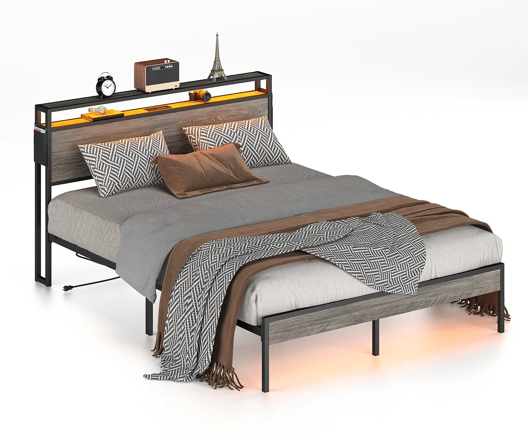 Storage Headboard with Charging Station:The bed frame comes with 2 storage shelves on the headboard that is perfect for putting books, tissue box, lamps, etc. With the built-in charging station: 2 outlets,1 USB ports and 1 typeC ports added for convenience, you can charge your phone or tablet without having to leave the comfort of your bed.