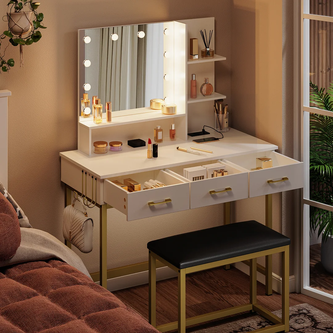 STYLISH AND FUNCTIONAL -Slim sleek and attractive design offers exceptional clarity of illuminated mirror reflections.Dressing table with lighted mirror, equipped with 10 bulbs, adjustable in three colors. Premium Material and Sturdy Construction - The tabletop is made of environmentally friendly MDF. The structure is solid, the iron legs ensure the stability of the table and stool, and the appearance is elegant and beautiful.