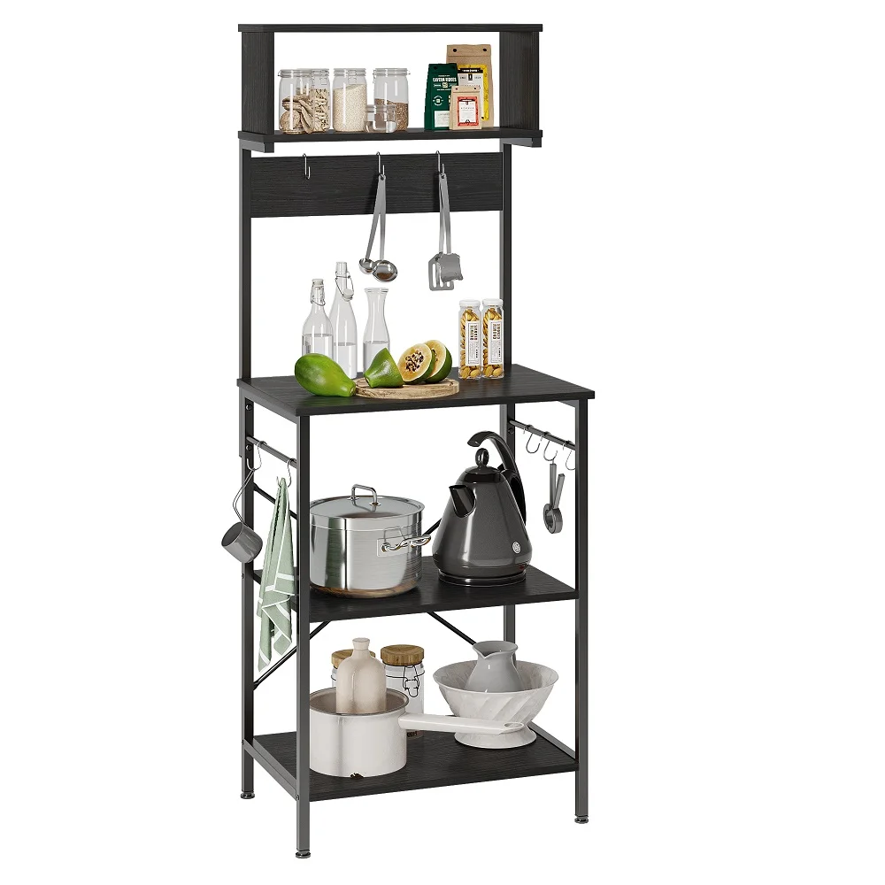 SUFFICIENT STORAGE SPACE: This microwave rack has 4 spacious shelves and 8 S shaped side hooks, which provide space for storing a variety of everyday essential, keeping your vegetables, microwave, coffee station, cooking and eating utensils, plates and other kitchen accessories in plain sight and easy to use.
