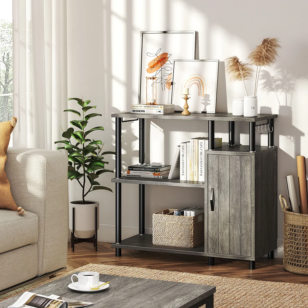 It is a perfect choice for a microwave stand, kitchen baker’s rack, coffee stand, spice rack organizer, kitchen island, spice rack organizer, multipurpose workstation shelf, office storage rack for your kitchen, living room, bedroom, office, and any occasion you need. Movable hooks on the sides to easily hang towels, gadgets, coffee cups, and other small items. Four-tier open shelves for you to store microwave, toaster, coffee maker, condiments, plates, and anything else you need. The cabinet with an adjustable inner shelf, which can help you organize your room more efficiently. The elegant and well-crafted appearance will add a distinctive flavor.