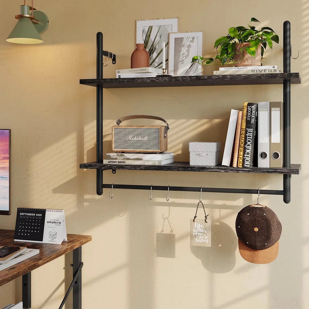Bestier industrial 31" floating shelf is a stylish and practical addition to any modern or retro home. Whether you're looking for extra storage space in your living room, bathroom, bedroom, kitchen, coffee bar, wine bar, garage, laundry room, or farmhouse, this shelf delivers. This kitchen shelf features a wide wall-mounted design, a 2-tier open shelf, and 8 S-shaped hooks for easy hanging of daily gadgets. With three color options - rustic, charcoal, and grey, the floating shelf is the perfect decorative addition to your home.