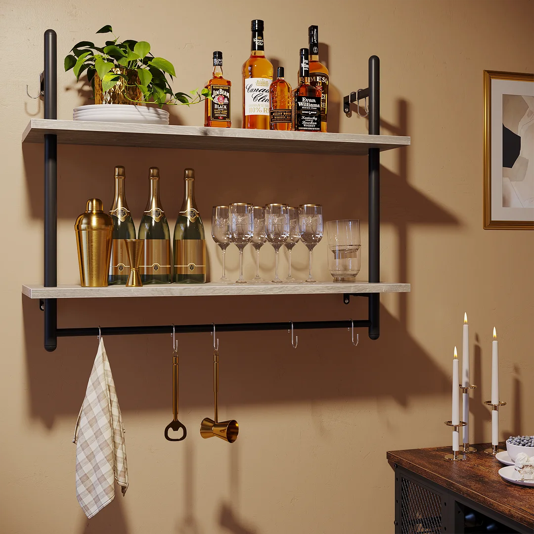 Bestier industrial 31" floating shelf is a stylish and practical addition to any modern or retro home. Whether you're looking for extra storage space in your living room, bathroom, bedroom, kitchen, coffee bar, wine bar, garage, laundry room, or farmhouse, this shelf delivers. This kitchen shelf features a wide wall-mounted design, a 2-tier open shelf, and 8 S-shaped hooks for easy hanging of daily gadgets. With three color options - rustic, charcoal, and grey, the floating shelf is the perfect decorative addition to your home.