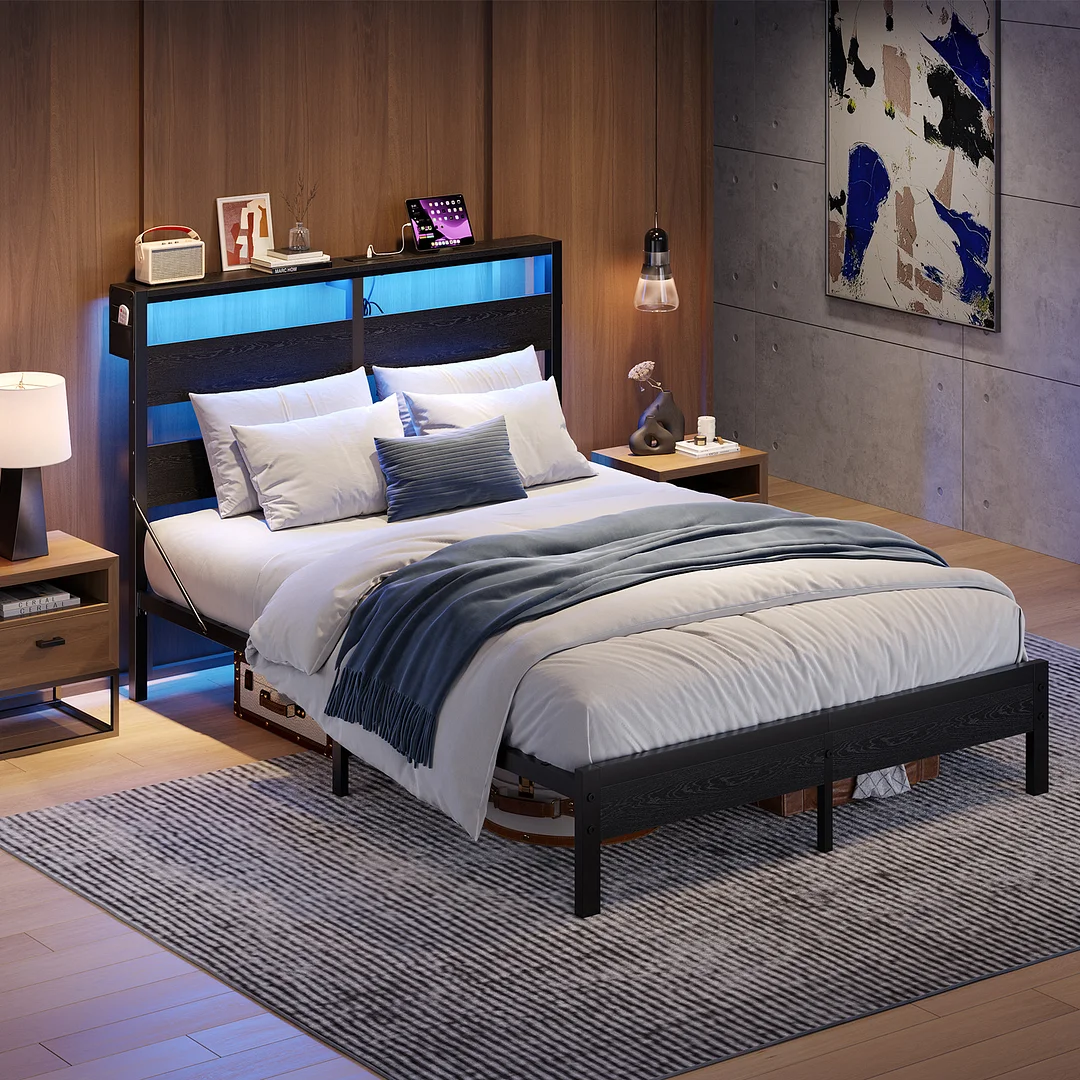 Bestier platform bed frame with LED lights headboard and USB charging station, metal bed frame with storage shelves in black, is the perfect addition to any bedroom, designed to meet all your needs. The headboard provides ample back and neck support, making reading or gaming more comfortable. Versatile storage space accommodates various storage needs. The angled design of the bed back prevents mattress slippage. Additionally, the adjustable smart LED RGB light strip easily creates a relaxing and cozy atmosphere for your sleeping environment.