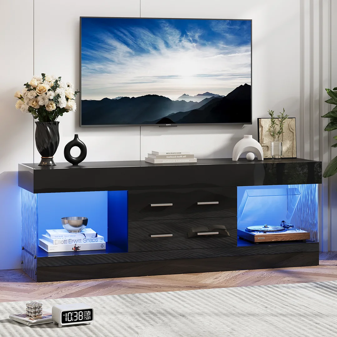 Features: High gloss delicate and durable black finish Large storage capacity can save your room space. Great minimalist and central entertainment with led lights Good hardness, high strength, and durability Suitable for 55 60 65 inch TV Suitable for your lounge room, living room, bedroom and more places