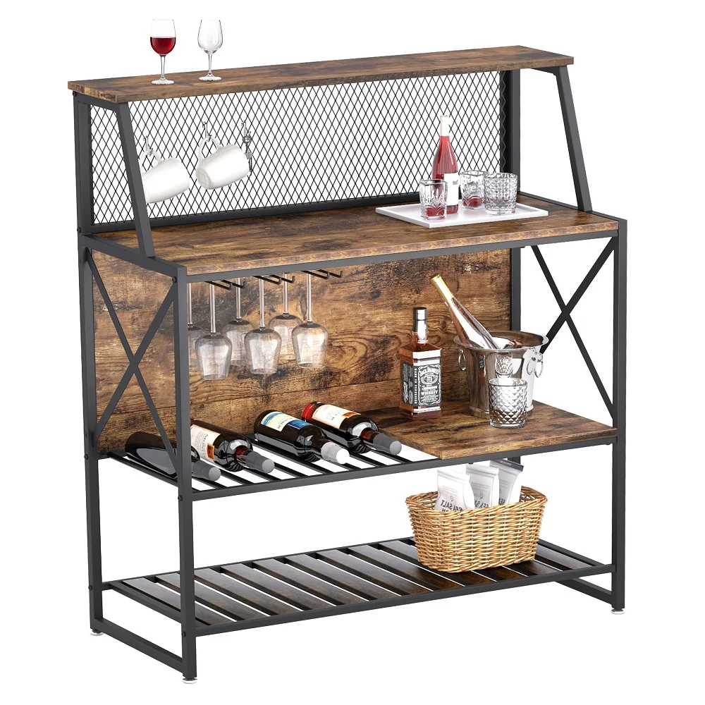 Large CAPACITY: Equipped with wine rack and glass holder holds up to 4 wine bottles and 6 pieces of stemware. The open shelf can meet all your storage needs. Also it's has iron mesh and hooks, you can store coffee cups or small tools, storage space is both large and well planned.